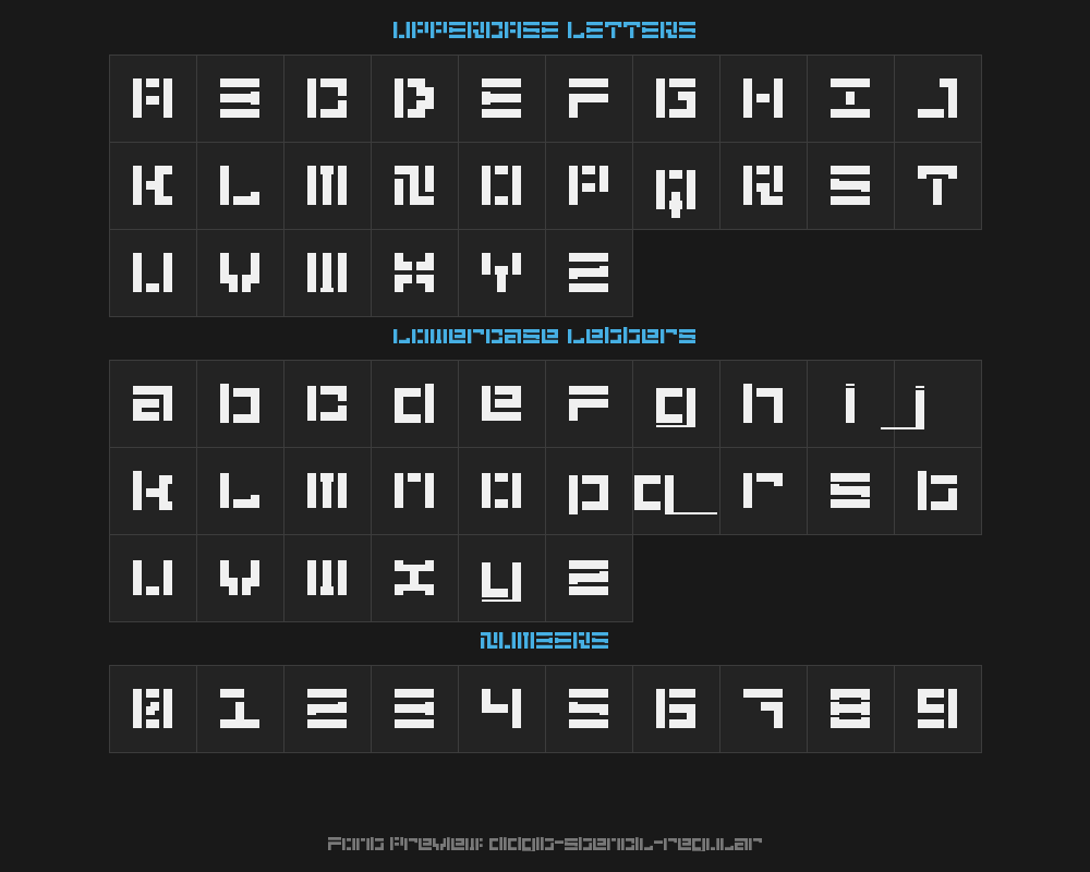 5didgit-stencil-regular is a font file with a size of 0.03 MB. The full font name is 5Didgit Stencil Regular, Version 1.0 version. It contains 213 characters, supports 8 Chinese characters. The copyright belongs to 5Didgit Stencil. 5didgit-stencil-regular font is available for free download, but commercial use requires confirmation on the 5Didgit Stencil official website whether it's free for commercial use.