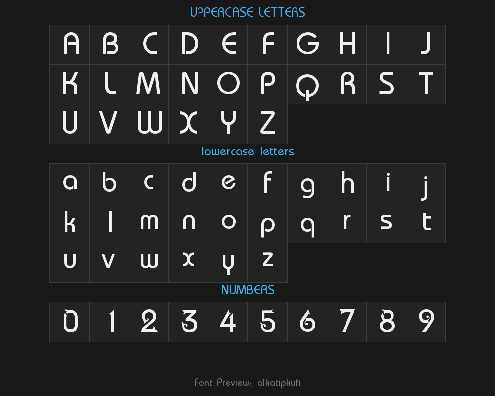 alkatipkufi is a font file with a size of 0.06 MB. The full font name is ALKATIP Kufi, Version 5.00 October 11, 2006 version. It contains 389 characters, supports 8 Chinese characters. The copyright belongs to ALKATIP Kufi. alkatipkufi font is available for free download, but commercial use requires confirmation on the ALKATIP Kufi official website whether it's free for commercial use.