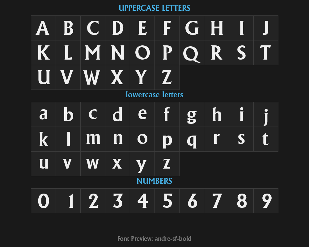 andre-sf-bold is a font file with a size of 0.05 MB. The full font name is Andre SF Bold, Altsys Fontographer 3.5 10.10.1993 version. It contains 208 characters, supports 8 Chinese characters. The copyright belongs to Andre SF. andre-sf-bold font is available for free download, but commercial use requires confirmation on the Andre SF official website whether it's free for commercial use.