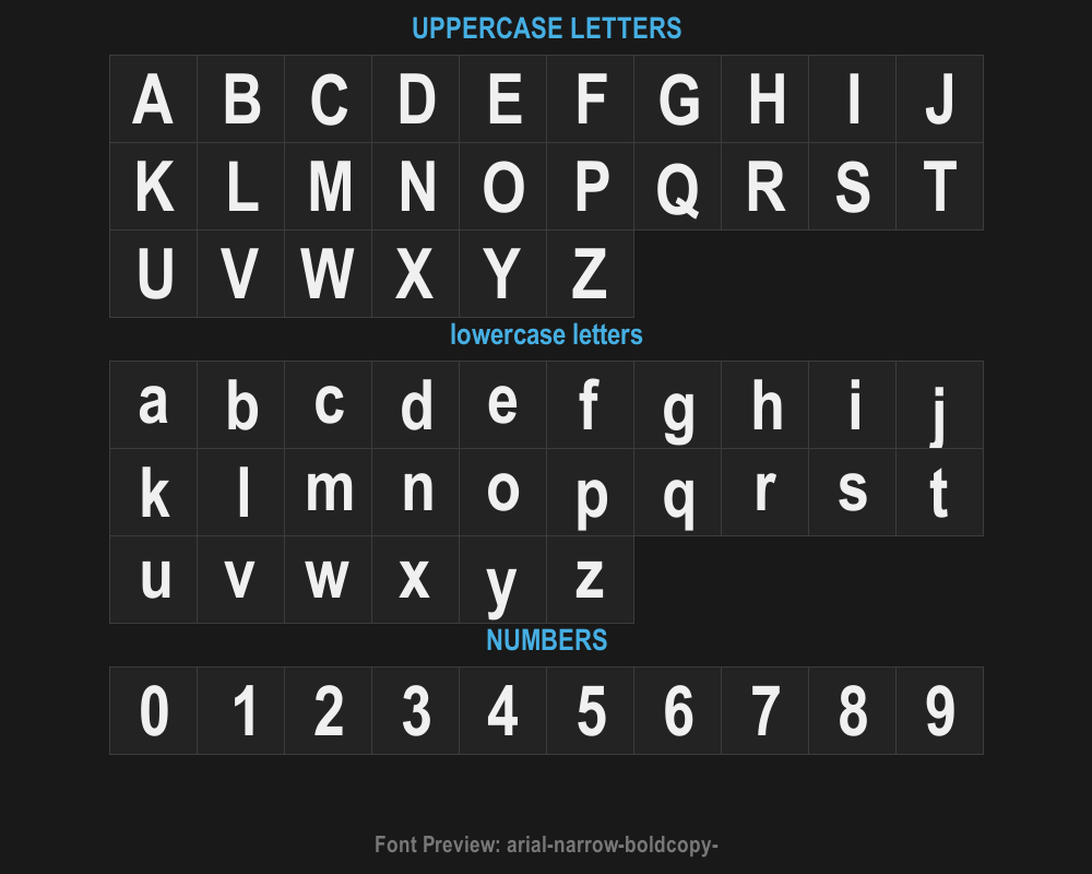 arial-narrow-boldcopy-3 is a font file with a size of 0.04 MB. The full font name is Arial Narrow Bold, 1.0 version. It contains 394 characters, supports 8 Chinese characters. The copyright belongs to Arial Narrow Bold. arial-narrow-boldcopy-3 font is available for free download, but commercial use requires confirmation on the Arial Narrow Bold official website whether it's free for commercial use.
