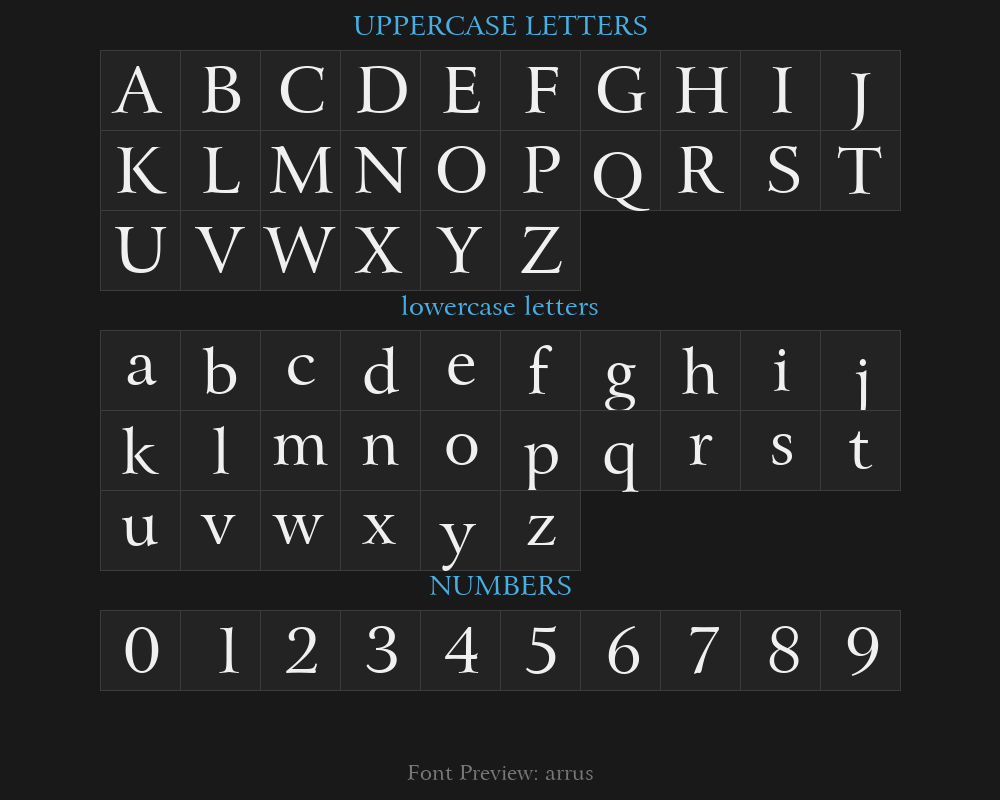 arrus is a font file with a size of 0.10 MB. The full font name is Arrus, 1.0 version. It contains 400 characters, supports 8 Chinese characters. The copyright belongs to Arrus. arrus font is available for free download, but commercial use requires confirmation on the Arrus official website whether it's free for commercial use.