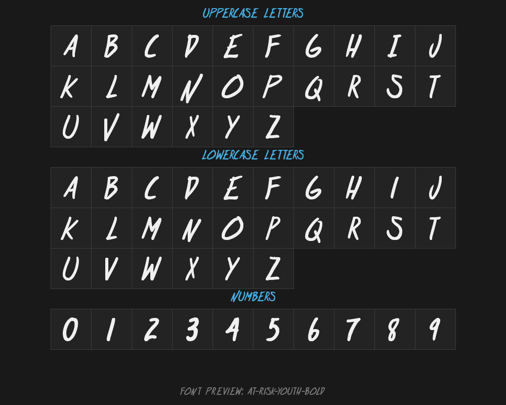 at-risk-youth-bold is a font file with a size of 0.07 MB. The full font name is at risk youth Bold, Version 1.00 February 25, 2013, initial release version. It contains 240 characters, supports 8 Chinese characters. The copyright belongs to at risk youth. at-risk-youth-bold font is available for free download, but commercial use requires confirmation on the at risk youth official website whether it's free for commercial use.