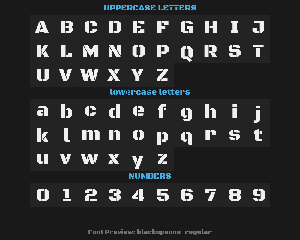 | Font description | Black Ops is a low contrast semi geometric typeface inspired by military stencil lettering. Black Ops is heavy, sturdy, and punchy. Because of the small cuts found in stencils like this one, Black Ops will look best when used at medium to large sizes. |