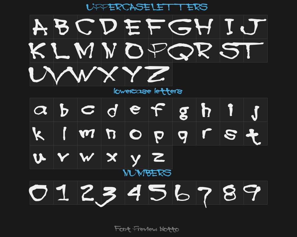 blotto40 is a font file with a size of 0.06 MB. The full font name is Blottooo40oz, 1.0 of this drunken and scrawly bold-o font version. It contains 81 characters, supports 8 Chinese characters. The copyright belongs to Blottooo40oz. blotto40 font is available for free download, but commercial use requires confirmation on the Blottooo40oz official website whether it's free for commercial use.