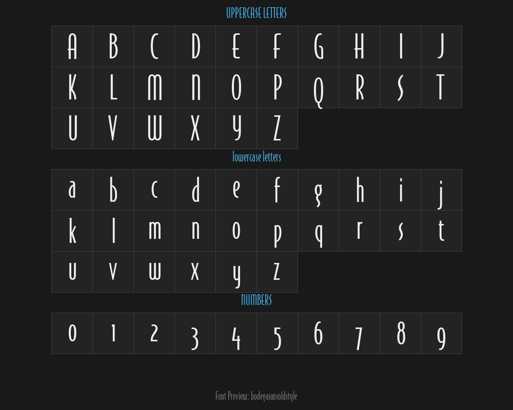bodegasansoldstyle is a font file with a size of 0.02 MB. The full font name is BodegaSansOldstyle, 001.001 version. It contains 243 characters, supports 8 Chinese characters. The copyright belongs to BodegaSansOldstyle. bodegasansoldstyle font is available for free download, but commercial use requires confirmation on the BodegaSansOldstyle official website whether it's free for commercial use.