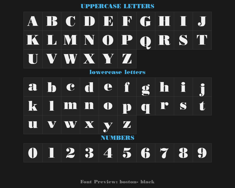 boston-black is a font file with a size of 0.04 MB. The full font name is Boston Black, (C)opyright 1992 W.S.I. 7 20 92 version. It contains 221 characters, supports 8 Chinese characters. The copyright belongs to Boston Black. boston-black font is available for free download, but commercial use requires confirmation on the Boston Black official website whether it's free for commercial use.