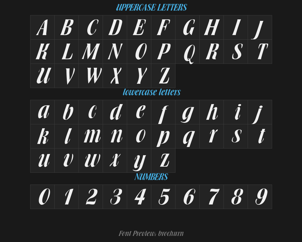 brochurn is a font file with a size of 0.05 MB. The full font name is Brochure, 1.0 version. It contains 189 characters, supports 8 Chinese characters. The copyright belongs to Brochure. brochurn font is available for free download, but commercial use requires confirmation on the Brochure official website whether it's free for commercial use.