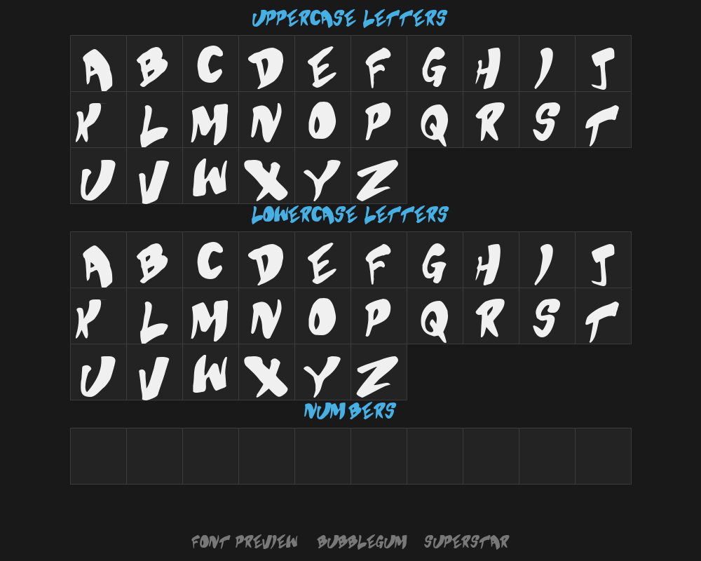bubblegum-superstar is a font file with a size of 0.02 MB. The full font name is Bubblegum Superstar, Macromedia Fontographer 4.1 9 28 98 version. It contains 92 characters, supports 8 Chinese characters. The copyright belongs to Bubblegum Superstar. bubblegum-superstar font is available for free download, but commercial use requires confirmation on the Bubblegum Superstar official website whether it's free for commercial use.