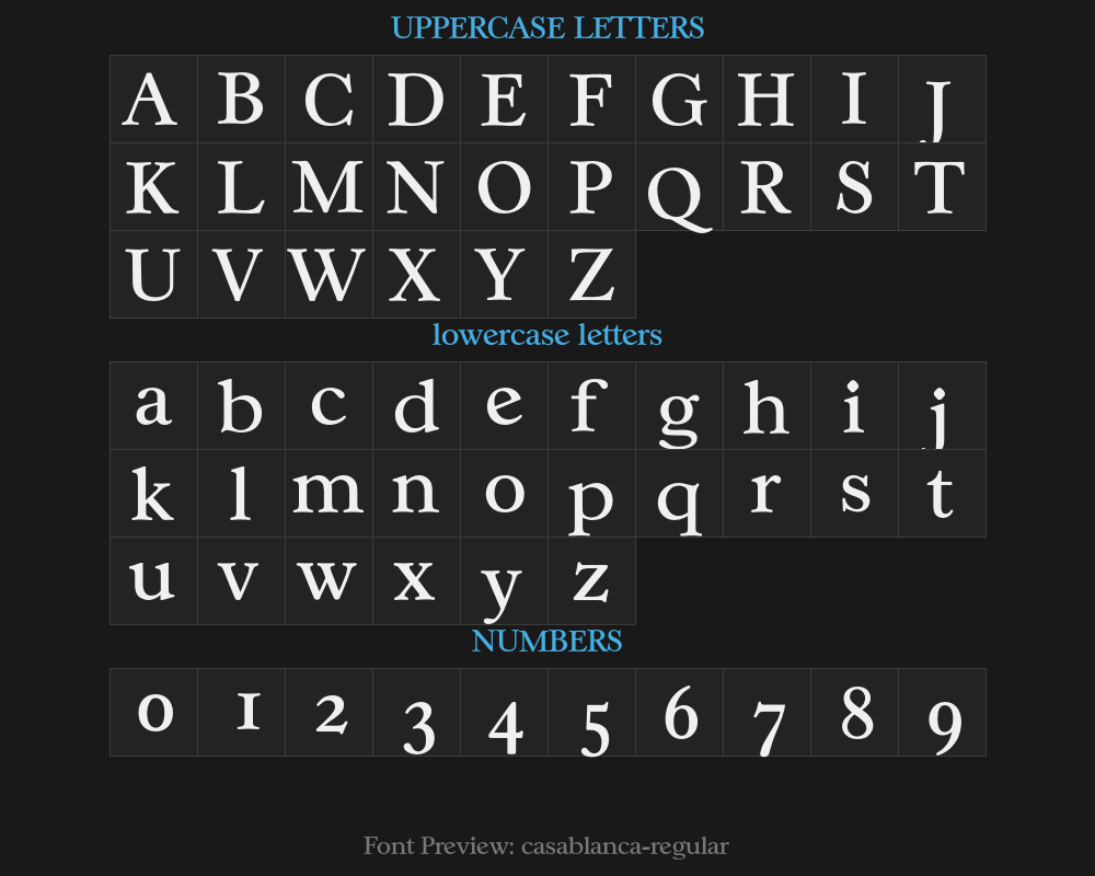 casablanca-regular is a font file with a size of 0.05 MB. The full font name is Casablanca-Regular, 001.001 version. It contains 226 characters, supports 8 Chinese characters. The copyright belongs to Casablanca-Regular. casablanca-regular font is available for free download, but commercial use requires confirmation on the Casablanca-Regular official website whether it's free for commercial use.