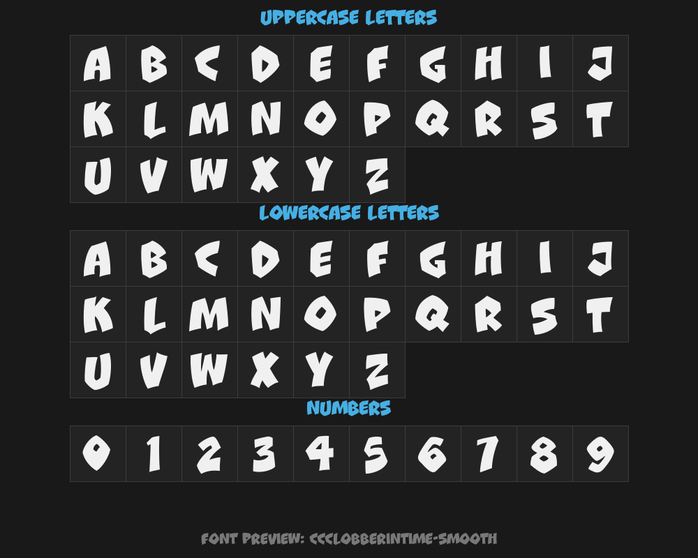 ccclobberintime-smooth is a font file with a size of 0.03 MB. The full font name is CCClobberinTime-Smooth, 001.000 version. It contains 100 characters, supports 8 Chinese characters. The copyright belongs to CCClobberinTime. ccclobberintime-smooth font is available for free download, but commercial use requires confirmation on the CCClobberinTime official website whether it's free for commercial use.
