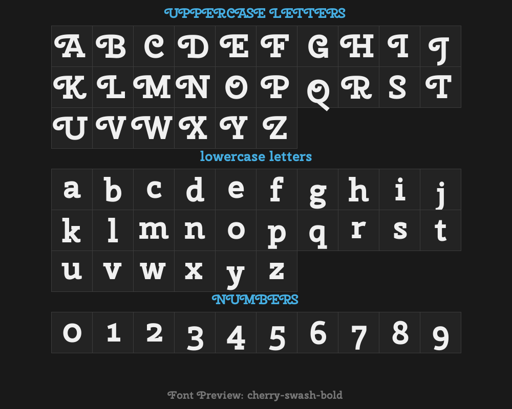 cherry-swash-bold is a font file with a size of 0.03 MB. The full font name is Cherry Swash Bold, Version 1.001 version. It contains 265 characters, supports 8 Chinese characters. The copyright belongs to Cherry Swash. cherry-swash-bold font is available for free download, but commercial use requires confirmation on the Cherry Swash official website whether it's free for commercial use.