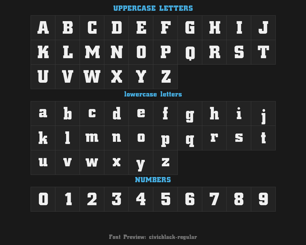 civicblack-regular is a font file with a size of 0.03 MB. The full font name is CivicBlack Regular, Publisher's Paradise -- Media Graphics International Inc. version. It contains 215 characters, supports 8 Chinese characters. The copyright belongs to CivicBlack. civicblack-regular font is available for free download, but commercial use requires confirmation on the CivicBlack official website whether it's free for commercial use.