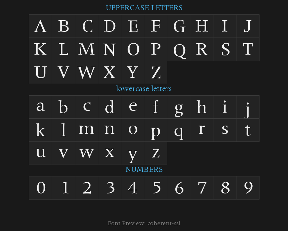coherent-ssi is a font file with a size of 0.05 MB. The full font name is Coherent SSi, 001.000 version. It contains 230 characters, supports 8 Chinese characters. The copyright belongs to Coherent SSi. coherent-ssi font is available for free download, but commercial use requires confirmation on the Coherent SSi official website whether it's free for commercial use.