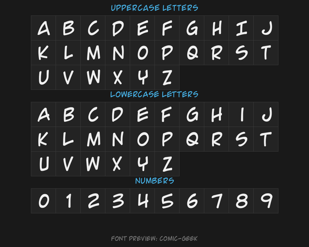comic-geek is a font file with a size of 0.02 MB. The full font name is Comic Geek, Macromedia Fontographer 4.1 08 01 2001 version. It contains 106 characters, supports 8 Chinese characters. The copyright belongs to Comic Geek. comic-geek font is available for free download, but commercial use requires confirmation on the Comic Geek official website whether it's free for commercial use.
