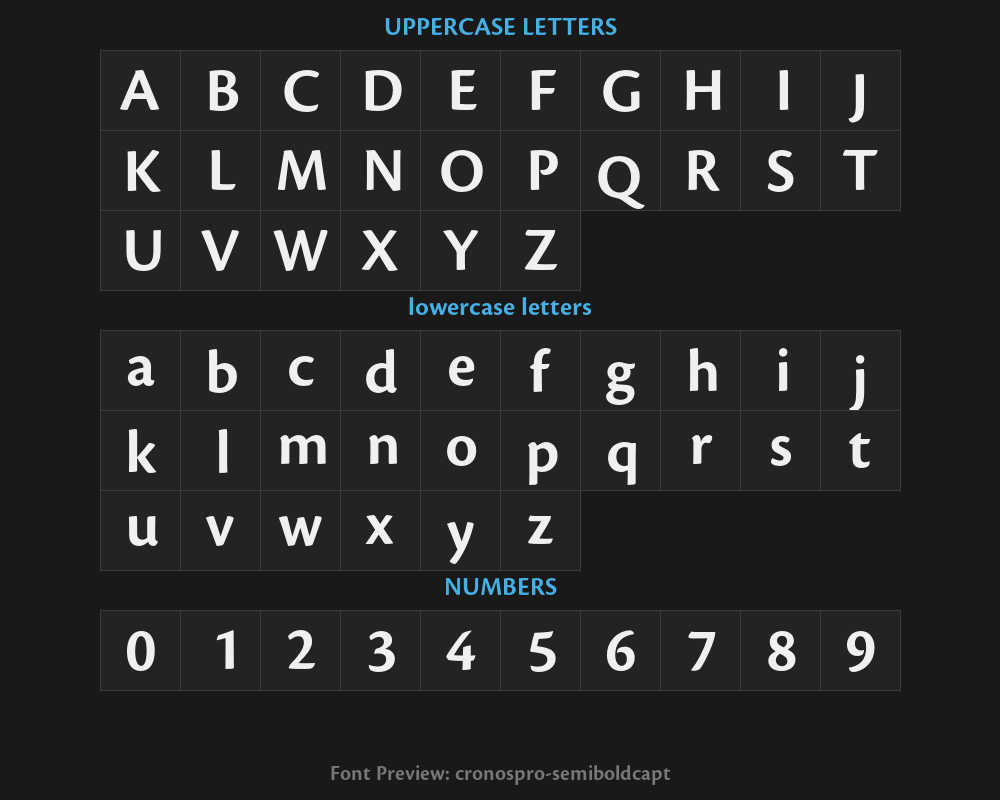 cronospro-semiboldcapt is a font file with a size of 0.11 MB. The full font name is CronosPro-SemiboldCapt, OTF 1.008;PS 001.000;Core 1.0.31;makeotf.lib1.4.1585 version. It contains 928 characters, supports 8 Chinese characters. The copyright belongs to Cronos Pro Light Caption. cronospro-semiboldcapt font is available for free download, but commercial use requires confirmation on the Cronos Pro Light Caption official website whether it's free for commercial use.