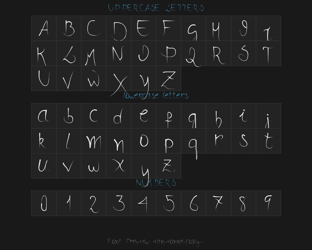 dan-donne-copy-1- is a font file with a size of 0.06 MB. The full font name is Dan• Donne, Version 1.002 2012 version. It contains 164 characters, supports 8 Chinese characters. The copyright belongs to Danï Donne. dan-donne-copy-1- font is available for free download, but commercial use requires confirmation on the Danï Donne official website whether it's free for commercial use.