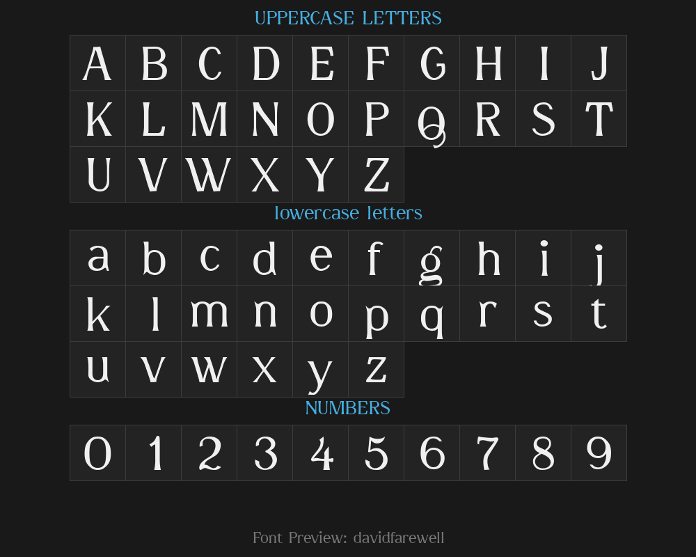 davidfarewell is a font file with a size of 0.05 MB. The full font name is DavidFarewell, Macromedia Fontographer 4.1.3 7 9 96 version. It contains 236 characters, supports 8 Chinese characters. The copyright belongs to DavidFarewell. davidfarewell font is available for free download, but commercial use requires confirmation on the DavidFarewell official website whether it's free for commercial use.
