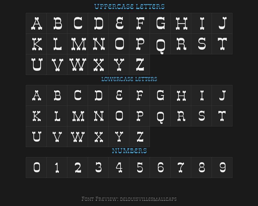 delouisvillesmallcaps is a font file with a size of 0.06 MB. The full font name is DeLouisvilleSmallCaps, 1 version. It contains 231 characters, supports 8 Chinese characters. The copyright belongs to DeLouisvilleSmallCaps. delouisvillesmallcaps font is available for free download, but commercial use requires confirmation on the DeLouisvilleSmallCaps official website whether it's free for commercial use.
