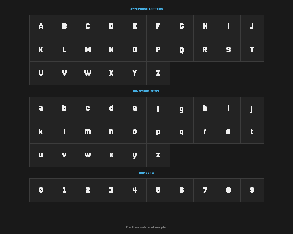 disparador-regular is a font file with a size of 0.04 MB. The full font name is Disparador Regular, Version 1.0 version. It contains 203 characters, supports 8 Chinese characters. The copyright belongs to Disparador. disparador-regular font is available for free download, but commercial use requires confirmation on the Disparador official website whether it's free for commercial use.