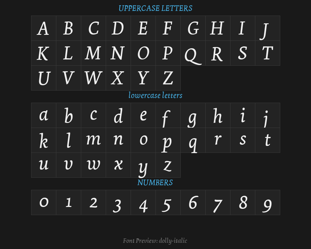 dolly-italic is a font file with a size of 0.05 MB. The full font name is Dolly-Italic, 001.000 version. It contains 246 characters, supports 8 Chinese characters. The copyright belongs to Dolly. dolly-italic font is available for free download, but commercial use requires confirmation on the Dolly official website whether it's free for commercial use.