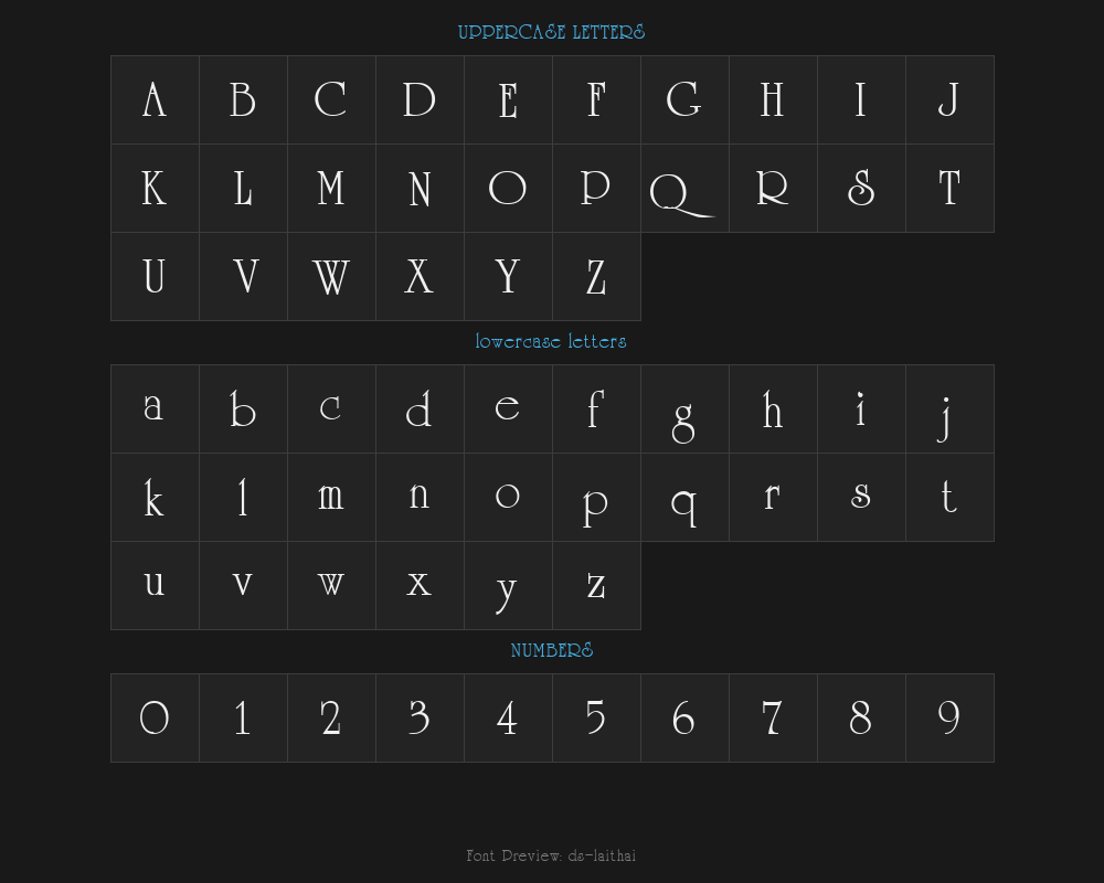 ds-laithai is a font file with a size of 0.07 MB. The full font name is DS-LaiThai, 001.000 version. It contains 221 characters, supports 8 Chinese characters. The copyright belongs to DS-LaiThai. ds-laithai font is available for free download, but commercial use requires confirmation on the DS-LaiThai official website whether it's free for commercial use.