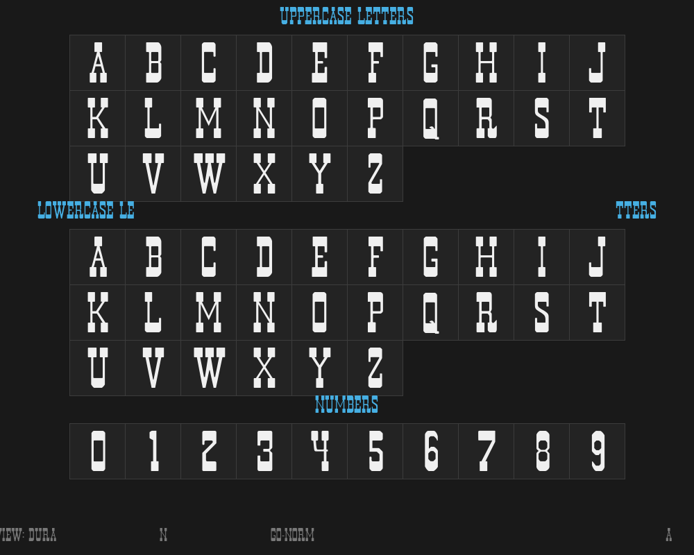 durango-normal is a font file with a size of 0.05 MB. The full font name is Durango-Normal, Converted from C WIN SYSTEM ST000167.TF1 by ALLTYPE version. It contains 394 characters, supports 8 Chinese characters. The copyright belongs to Durango-Normal. durango-normal font is available for free download, but commercial use requires confirmation on the Durango-Normal official website whether it's free for commercial use.