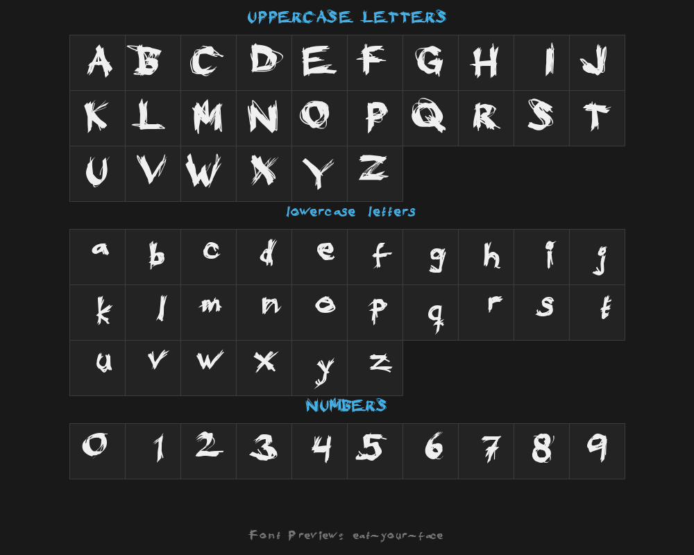 eat-your-face is a font file with a size of 0.05 MB. The full font name is Eat your face, 2001-04-04 | v1.0 version. It contains 92 characters, supports 8 Chinese characters. The copyright belongs to Eat your face. eat-your-face font is available for free download, but commercial use requires confirmation on the Eat your face official website whether it's free for commercial use.