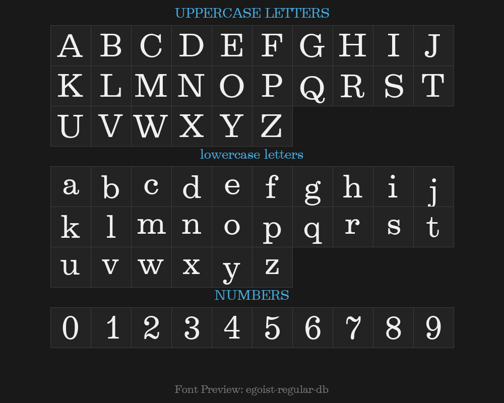 egoist-regular-db is a font file with a size of 0.05 MB. The full font name is Egoist-Regular DB, 1.0 Mon Oct 30 14 23 27 1995 version. It contains 203 characters, supports 8 Chinese characters. The copyright belongs to Egoist DB. egoist-regular-db font is available for free download, but commercial use requires confirmation on the Egoist DB official website whether it's free for commercial use.
