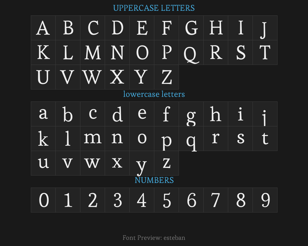 esteban is a font file with a size of 0.04 MB. The full font name is Esteban, Version 1.002 version. It contains 257 characters, supports 8 Chinese characters. The copyright belongs to Esteban. esteban font is available for free download, but commercial use requires confirmation on the Esteban official website whether it's free for commercial use.