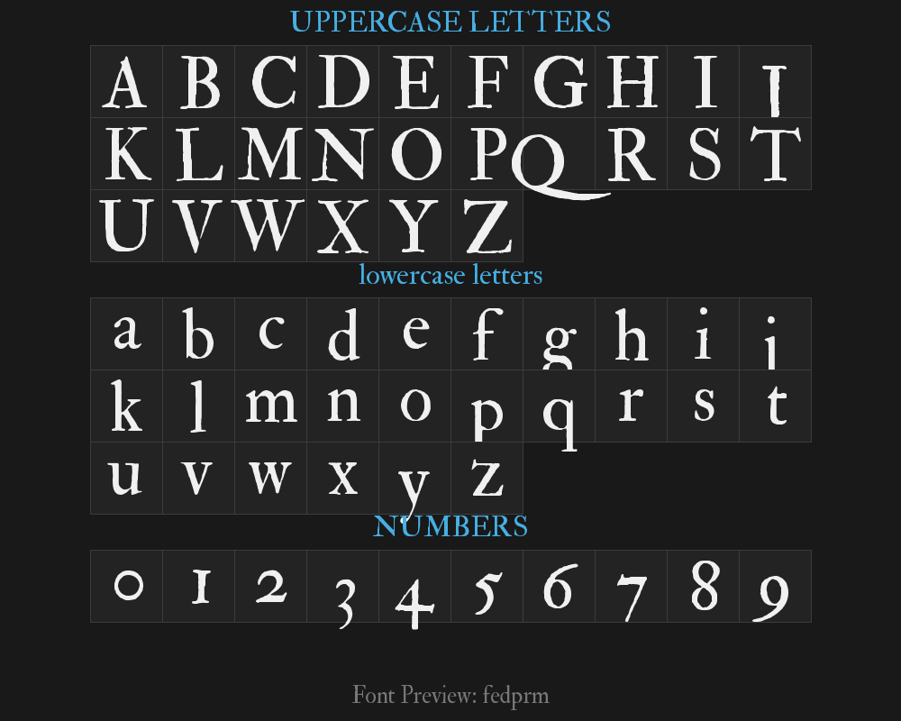 fedprm2 is a font file with a size of 0.15 MB. The full font name is IM FELL Double Pica Roman, 2.0 version. It contains 229 characters, supports 8 Chinese characters. The copyright belongs to IM FELL Double Pica. fedprm2 font is available for free download, but commercial use requires confirmation on the IM FELL Double Pica official website whether it's free for commercial use.