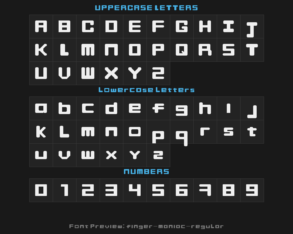 finger-maniac-regular is a font file with a size of 0.02 MB. The full font name is Finger-Maniac Regular, Version 1.0 version. It contains 98 characters, supports 8 Chinese characters. The copyright belongs to Finger-Maniac. finger-maniac-regular font is available for free download, but commercial use requires confirmation on the Finger-Maniac official website whether it's free for commercial use.