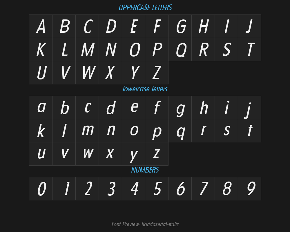 floridaserial-italic is a font file with a size of 0.06 MB. The full font name is FloridaSerial-Italic, Version 1.0 27-08-2002 version. It contains 251 characters, supports 8 Chinese characters. The copyright belongs to FloridaSerial. floridaserial-italic font is available for free download, but commercial use requires confirmation on the FloridaSerial official website whether it's free for commercial use.