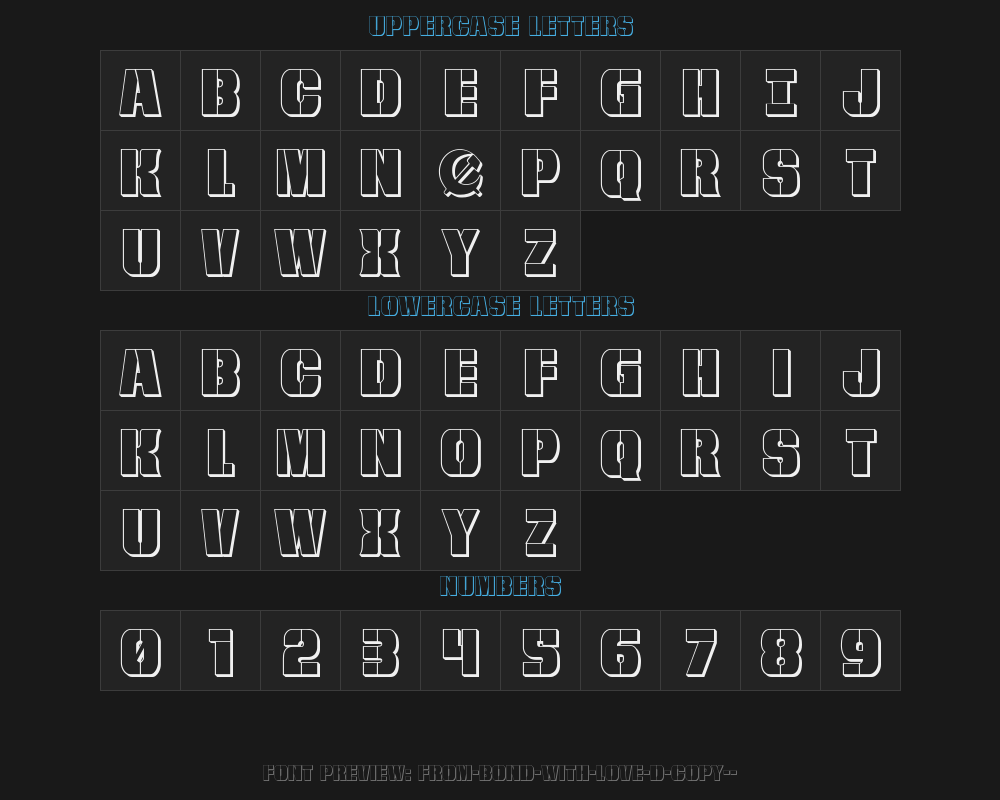 from-bond-with-love-3d-copy-1- is a font file with a size of 0.05 MB. The full font name is From BOND With Love 3D, Version 1.1; 2015 version. It contains 221 characters, supports 8 Chinese characters. The copyright belongs to From BOND With Love 3D. from-bond-with-love-3d-copy-1- font is available for free download, but commercial use requires confirmation on the From BOND With Love 3D official website whether it's free for commercial use.