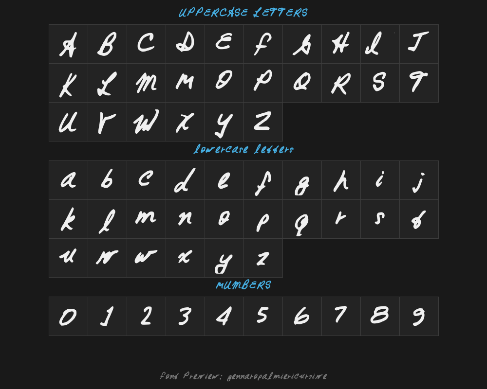 gennaropalmiericursive is a font file with a size of 0.02 MB. The full font name is GennaroPalmieriCursive, Version 001.000 version. It contains 140 characters, supports 8 Chinese characters. The copyright belongs to GennaroPalmieriCursive. gennaropalmiericursive font is available for free download, but commercial use requires confirmation on the GennaroPalmieriCursive official website whether it's free for commercial use.