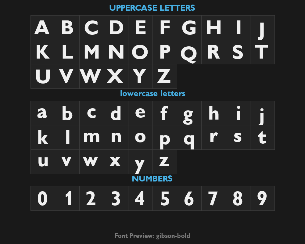 gibson-bold is a font file with a size of 0.05 MB. The full font name is Gibson-Bold, Version 1.0 20-10-2002 version. It contains 207 characters, supports 8 Chinese characters. The copyright belongs to Gibson. gibson-bold font is available for free download, but commercial use requires confirmation on the Gibson official website whether it's free for commercial use.