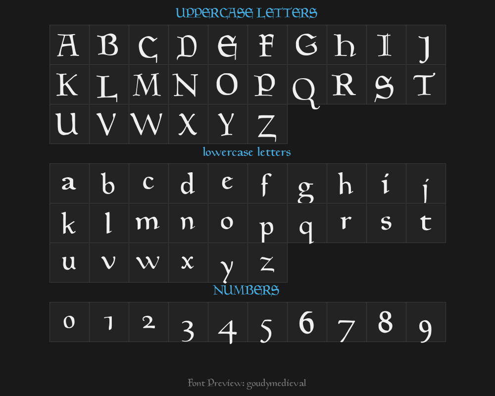 goudymedieval is a font file with a size of 0.05 MB. The full font name is GoudyMedieval, Converted from C TTFONTS GOUDYMED.TF1 by ALLTYPE version. It contains 394 characters, supports 8 Chinese characters. The copyright belongs to GoudyMedieval. goudymedieval font is available for free download, but commercial use requires confirmation on the GoudyMedieval official website whether it's free for commercial use.