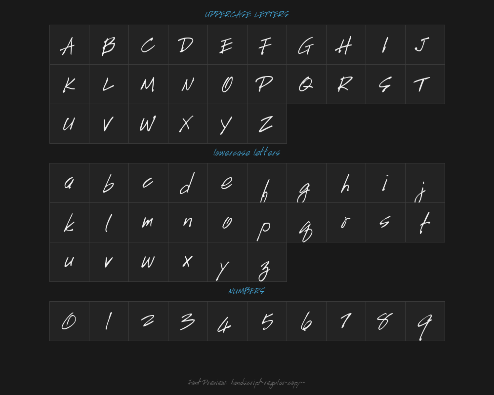 handscript-regular-copy-1- is a font file with a size of 0.05 MB. The full font name is HandScript Regular, W.S.I. Int'l v1.1 for GSP 6 20 95 version. It contains 227 characters, supports 8 Chinese characters. The copyright belongs to HandScript. handscript-regular-copy-1- font is available for free download, but commercial use requires confirmation on the HandScript official website whether it's free for commercial use.