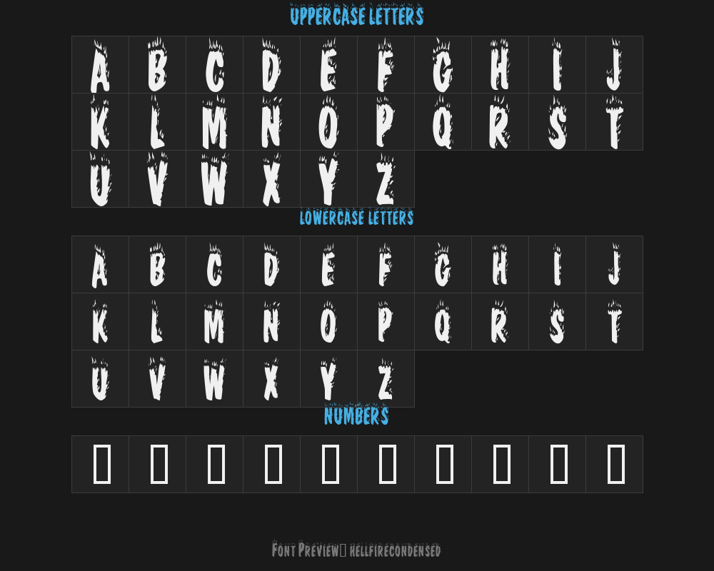 hellfirecondensed is a font file with a size of 0.04 MB. The full font name is HellfireCondensed, Rev. 003.000 version. It contains 58 characters, supports 8 Chinese characters. The copyright belongs to HellfireCondensed. hellfirecondensed font is available for free download, but commercial use requires confirmation on the HellfireCondensed official website whether it's free for commercial use.