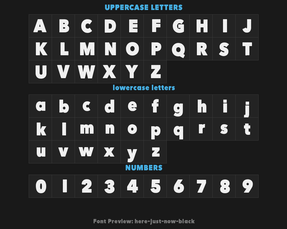 here-just-now-black is a font file with a size of 0.06 MB. The full font name is Here Just Now Black, Version 1.00 April 4, 2016, initial release version. It contains 213 characters, supports 8 Chinese characters. The copyright belongs to Here Just Now Black. here-just-now-black font is available for free download, but commercial use requires confirmation on the Here Just Now Black official website whether it's free for commercial use.