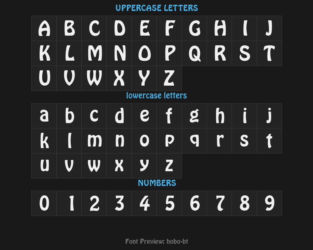 hobo-bt is a font file with a size of 0.05 MB. The full font name is Hobo BT, mfgpctt-v1.52 Monday, January 25, 1993 11 46 28 am (EST) version. It contains 257 characters, supports 8 Chinese characters. The copyright belongs to Hobo BT. hobo-bt font is available for free download, but commercial use requires confirmation on the Hobo BT official website whether it's free for commercial use.
