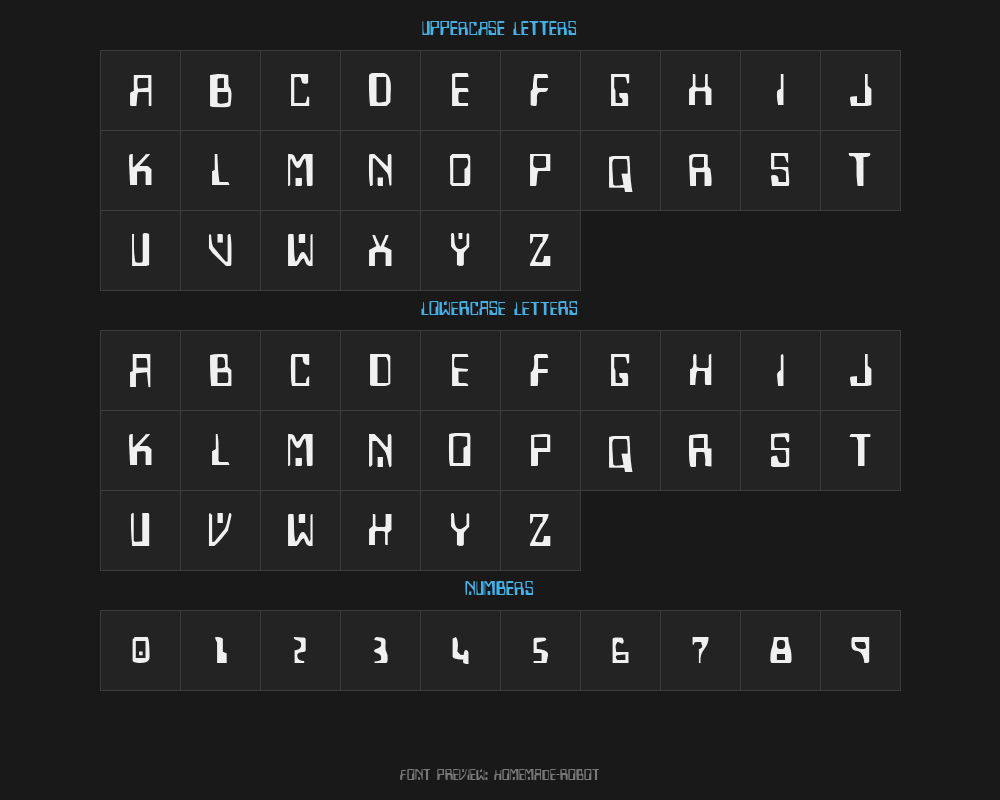 homemade-robot is a font file with a size of 0.03 MB. The full font name is Homemade Robot, 1 version. It contains 93 characters, supports 8 Chinese characters. The copyright belongs to Homemade Robot. homemade-robot font is available for free download, but commercial use requires confirmation on the Homemade Robot official website whether it's free for commercial use.
