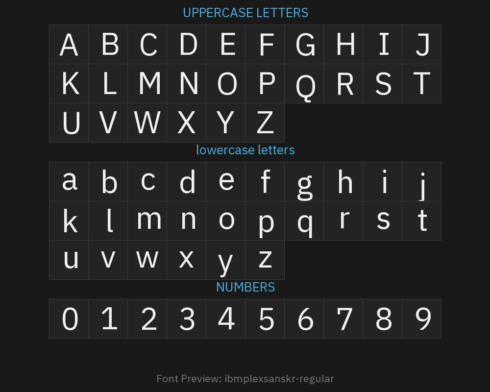 ibmplexsanskr-regular is a font file with a size of 2.33 MB. The full font name is IBM Plex Sans KR, Version 1.001 version. It contains 12224 characters, supports 8 Chinese characters. The copyright belongs to IBM Plex Sans KR. ibmplexsanskr-regular font is available for free download, but commercial use requires confirmation on the IBM Plex Sans KR official website whether it's free for commercial use.