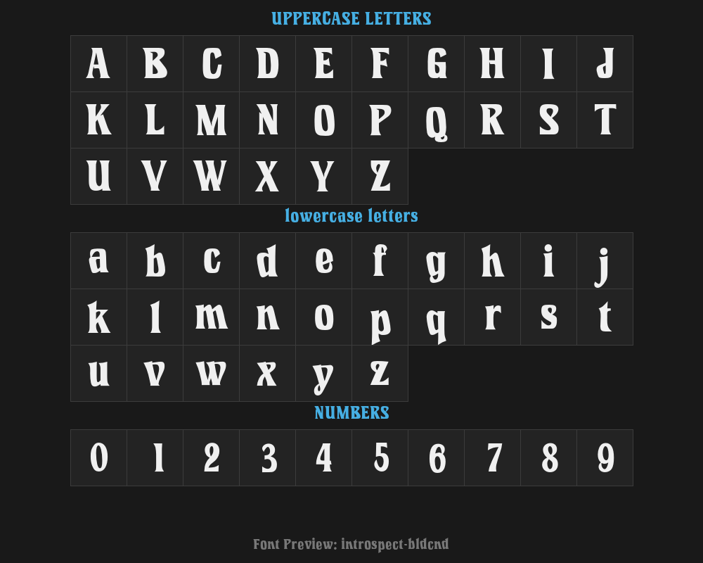 introspect-bldcnd is a font file with a size of 0.03 MB. The full font name is Introspect-BldCnd, 4.0 version. It contains 220 characters, supports 8 Chinese characters. The copyright belongs to Introspect Condensed. introspect-bldcnd font is available for free download, but commercial use requires confirmation on the Introspect Condensed official website whether it's free for commercial use.