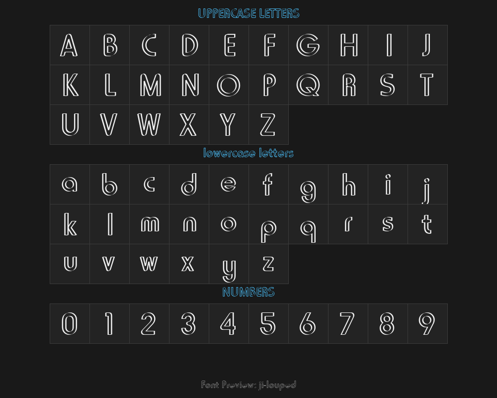 ji-louped is a font file with a size of 0.04 MB. The full font name is JI-Louped, Macromedia Fontographer 4.1 5 29 2001 version. It contains 96 characters, supports 8 Chinese characters. The copyright belongs to JI-Louped. ji-louped font is available for free download, but commercial use requires confirmation on the JI-Louped official website whether it's free for commercial use.