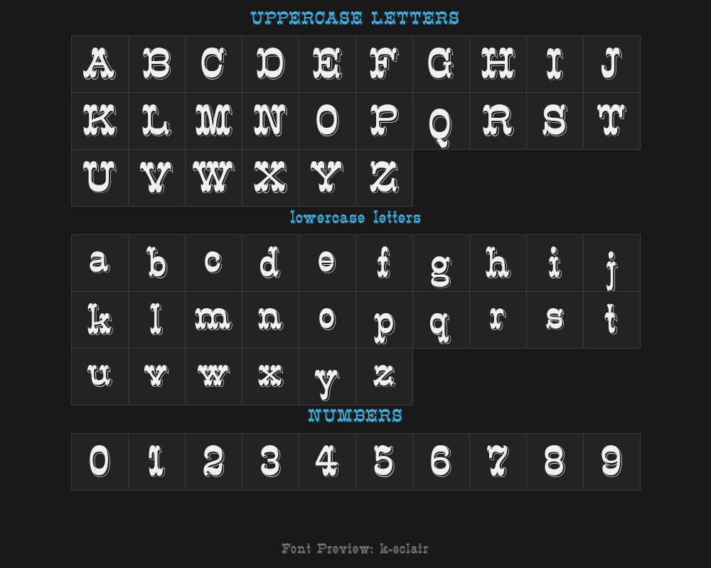 k22-eclair is a font file with a size of 0.07 MB. The full font name is K22 Eclair, 1.0 version. It contains 206 characters, supports 8 Chinese characters. The copyright belongs to K22 Eclair. k22-eclair font is available for free download, but commercial use requires confirmation on the K22 Eclair official website whether it's free for commercial use.