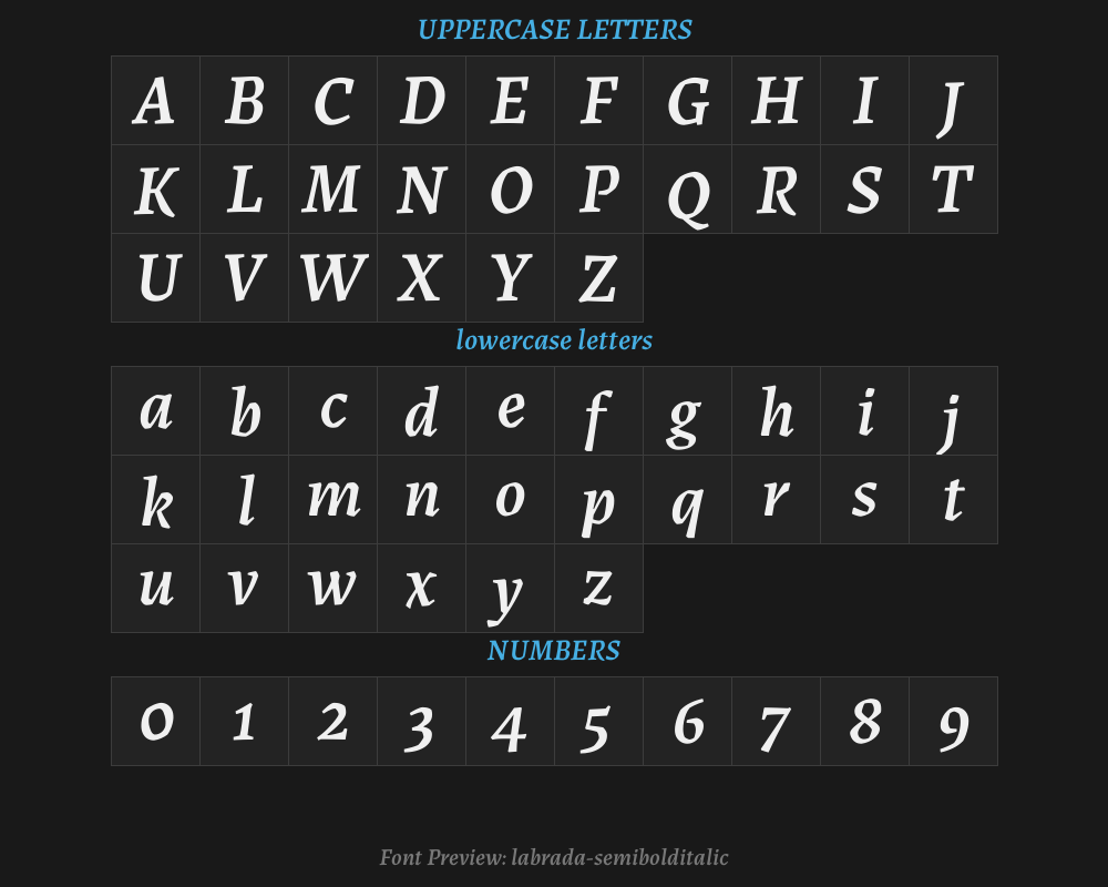 labrada-semibolditalic is a font file with a size of 0.07 MB. The full font name is Labrada SemiBold Italic, Version 1.000 version. It contains 579 characters, supports 8 Chinese characters. The copyright belongs to Labrada SemiBold. labrada-semibolditalic font is available for free download, but commercial use requires confirmation on the Labrada SemiBold official website whether it's free for commercial use.