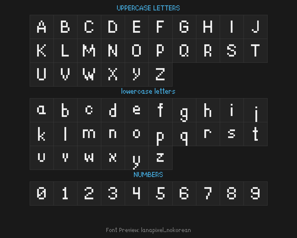 lanapixel_nokorean is a font file with a size of 1.33 MB. The full font name is LanaPixel, Version 001.005 version. It contains 8389 characters, supports 6972 Chinese characters. The copyright belongs to LanaPixel. lanapixel_nokorean font is available for free download, but commercial use requires confirmation on the LanaPixel official website whether it's free for commercial use.