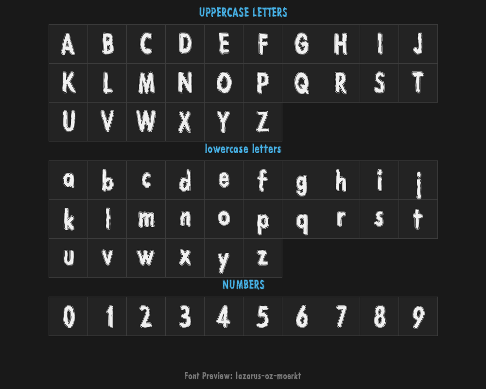 lazarus-oz-moerkt is a font file with a size of 0.09 MB. The full font name is Lazarus Oz Moerkt, Version 1.00 January 25, 2016, initial release version. It contains 193 characters, supports 8 Chinese characters. The copyright belongs to Lazarus Oz Moerkt. lazarus-oz-moerkt font is available for free download, but commercial use requires confirmation on the Lazarus Oz Moerkt official website whether it's free for commercial use.