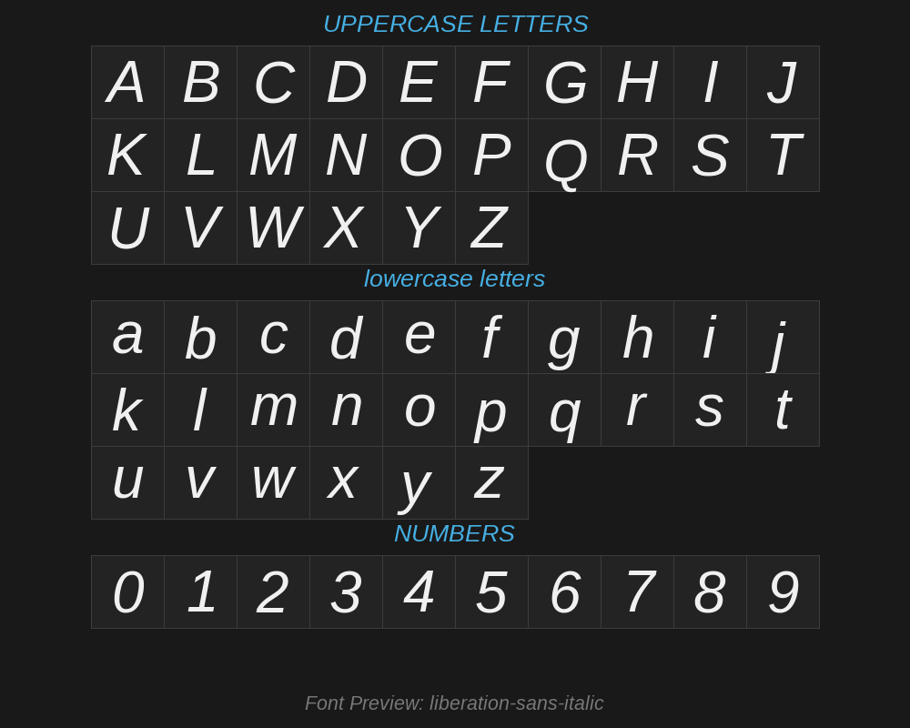 liberation-sans-italic is a font file with a size of 0.07 MB. The full font name is Liberation Sans Italic, Version 1.00 version. It contains 655 characters, supports 8 Chinese characters. The copyright belongs to Liberation Sans. liberation-sans-italic font is available for free download, but commercial use requires confirmation on the Liberation Sans official website whether it's free for commercial use.