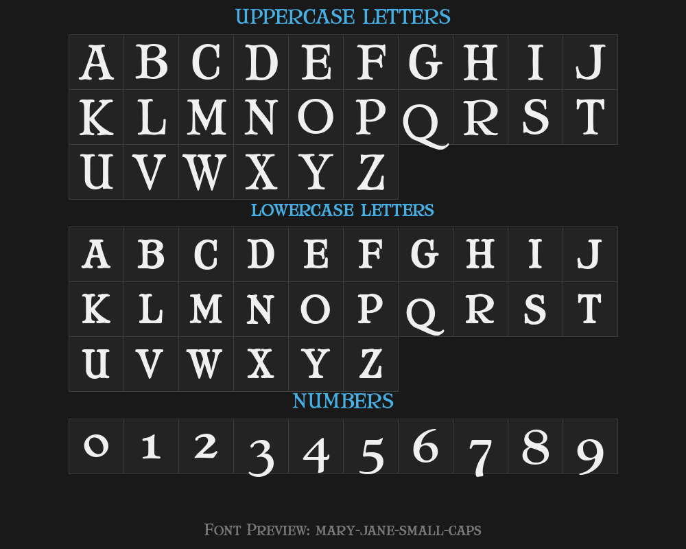 mary-jane-small-caps is a font file with a size of 0.12 MB. The full font name is Mary Jane Small Caps, 1.0 version. It contains 255 characters, supports 8 Chinese characters. The copyright belongs to Mary Jane Small Caps. mary-jane-small-caps font is available for free download, but commercial use requires confirmation on the Mary Jane Small Caps official website whether it's free for commercial use.